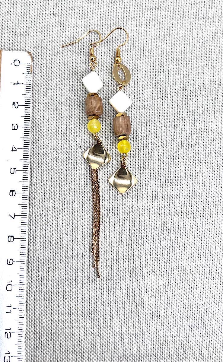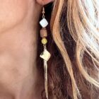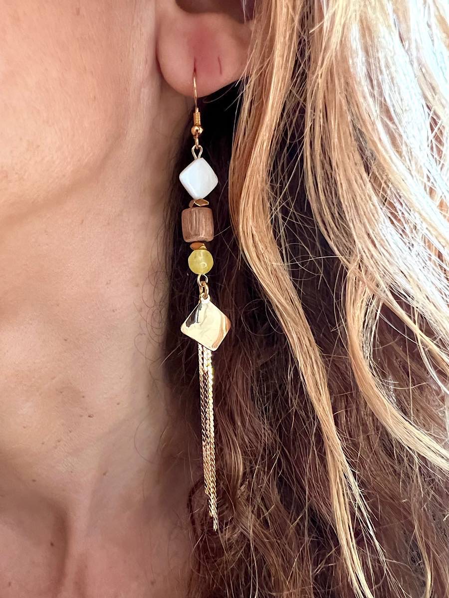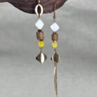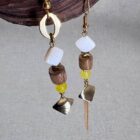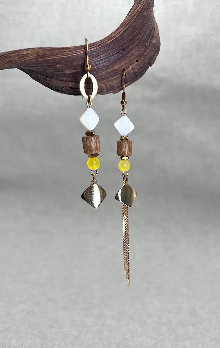 Boucles d’oreilles Asymétriques en Laiton doré à l’or fin, Agathe jaune, nacre et bois
