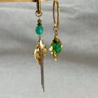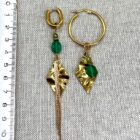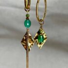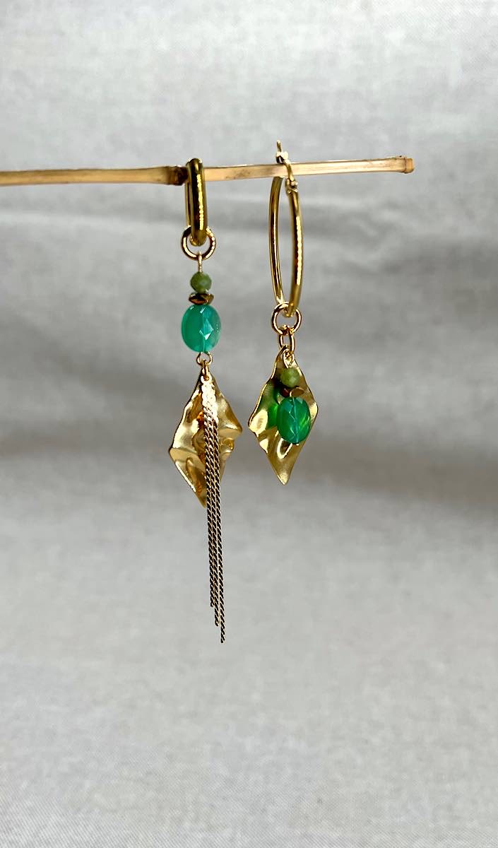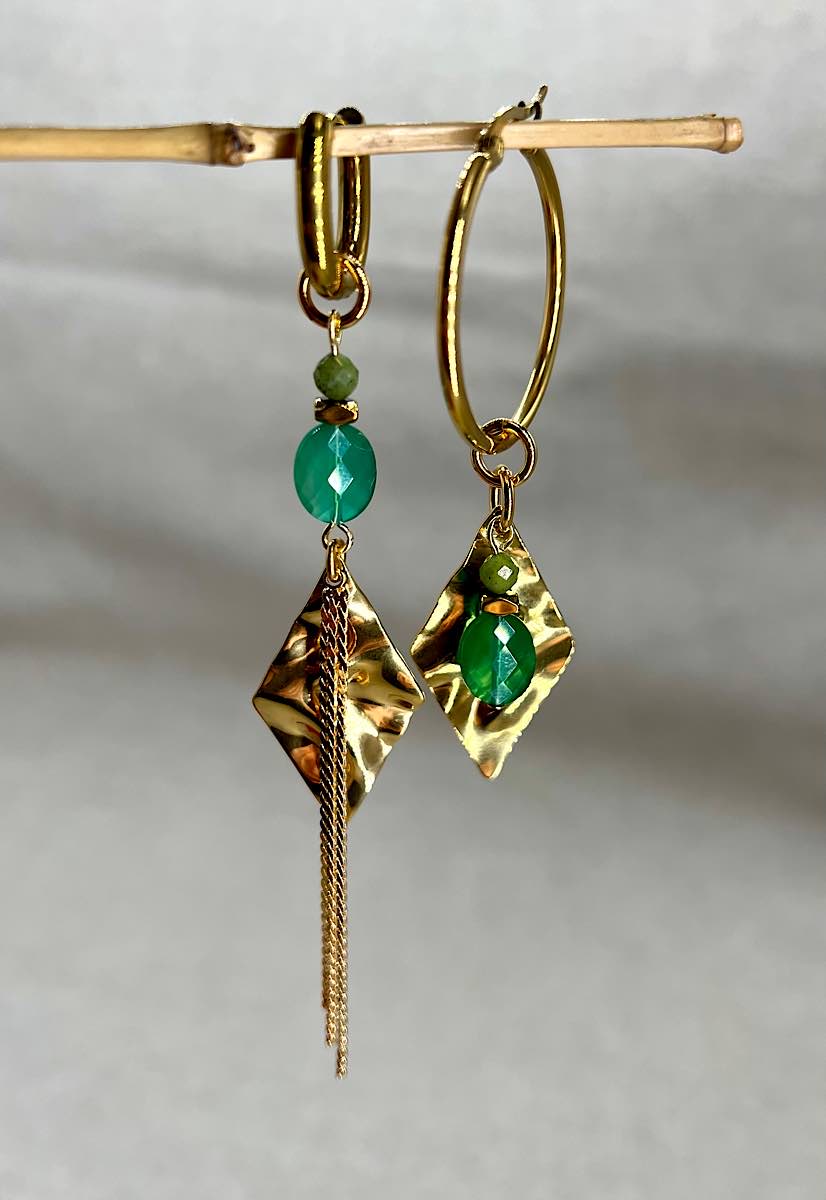 Boucles d’oreilles Asymétriques en Laiton brut et doré, Agathe verte, les montures créoles de ces boucles sont en acier Inoxydable