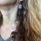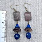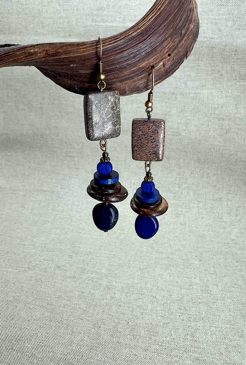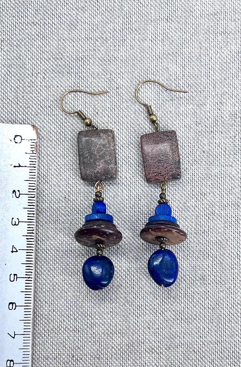 Boucles d’oreilles laiton, lapis-lazuli, jaspe et perles en bois