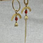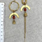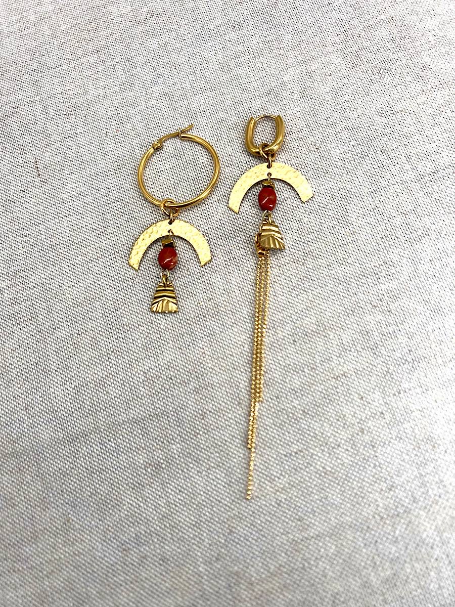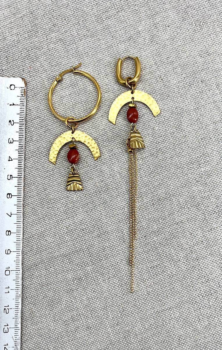 Boucles d’oreilles Asymétriques en Laiton brut et jaspe rouge, les montures créoles de ces boucles sont en acier Inoxydable