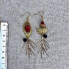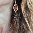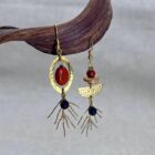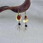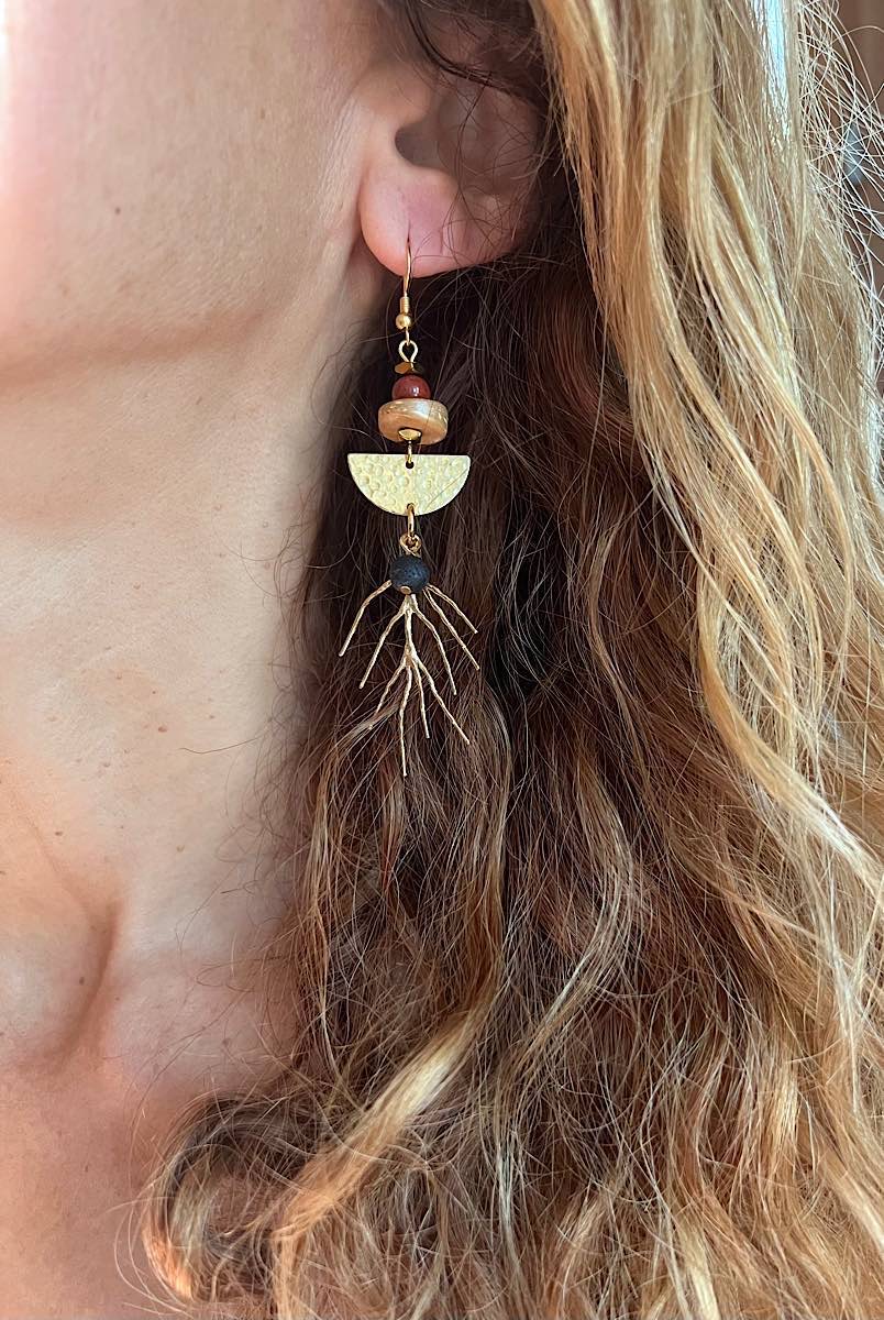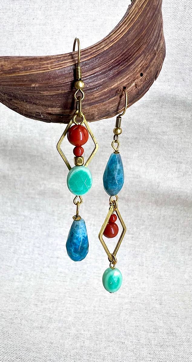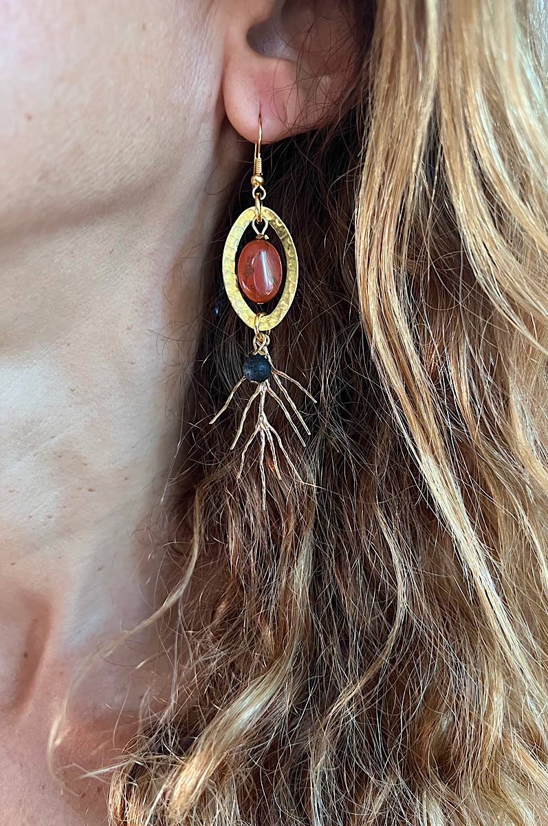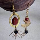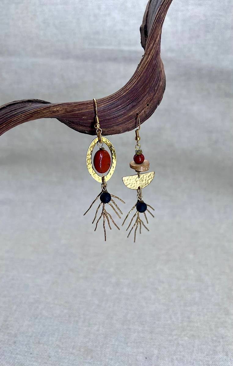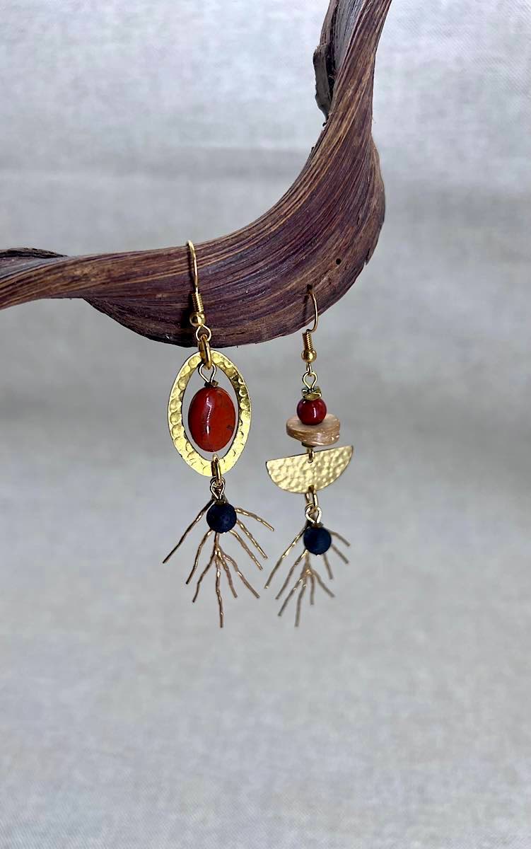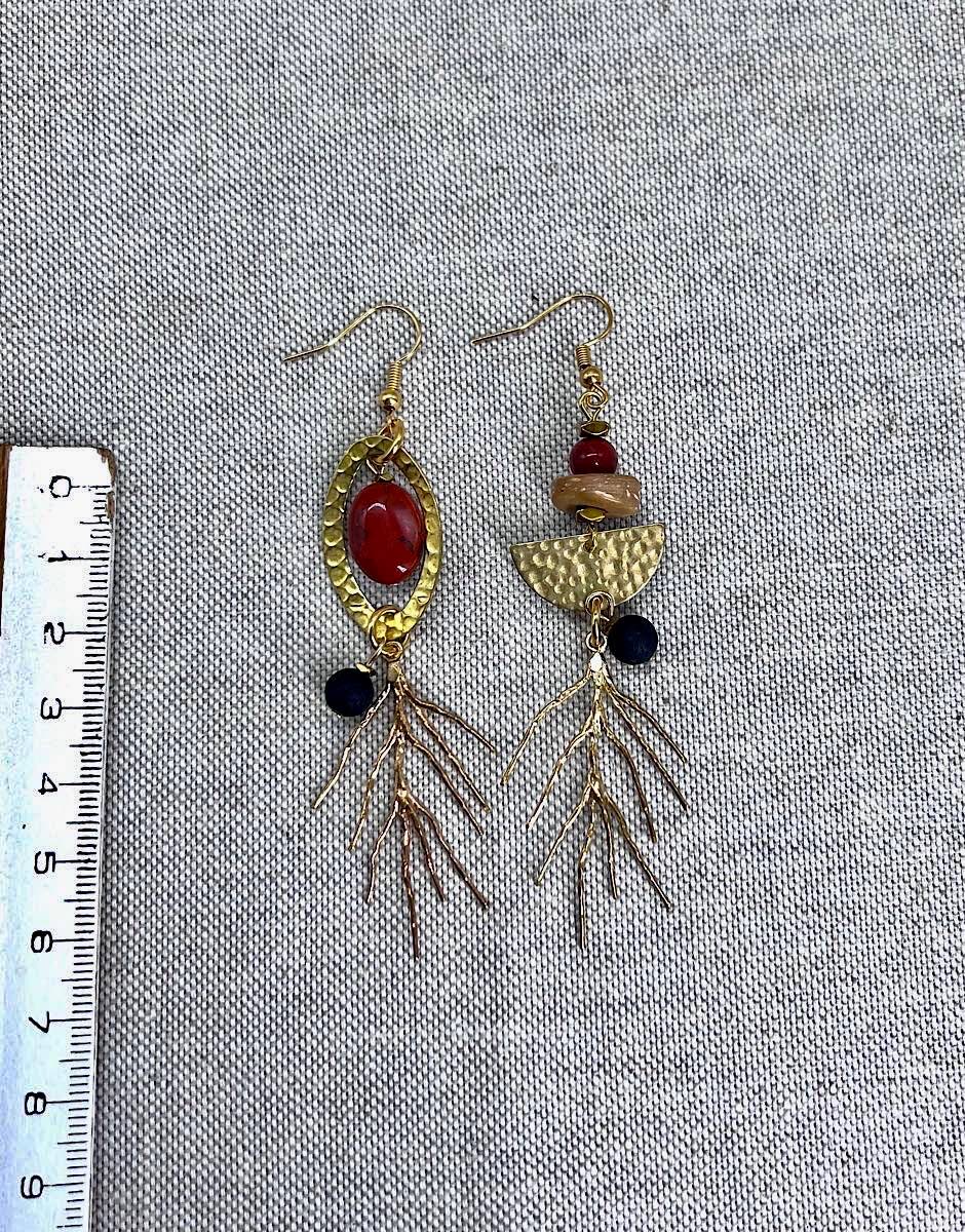 Boucles d’oreilles Asymétriques en Laiton doré, jaspe rouge, pierre de lave